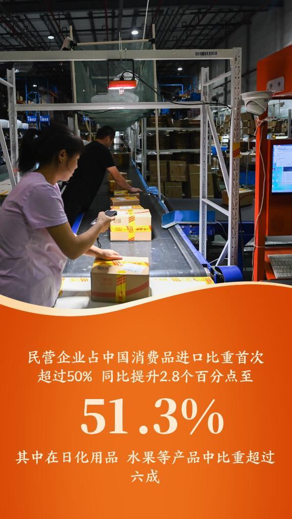 民營(yíng)企業(yè)占我國(guó)消費(fèi)品進(jìn)口比重首次超過(guò)50%,同比提升2.8個(gè)百分點(diǎn)至51.3%,其中在日化用品、水果等產(chǎn)品中比重超過(guò)六成。