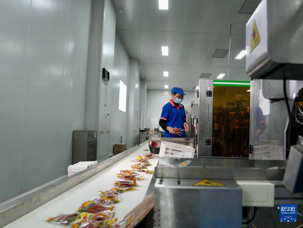 4月8日,在沈陽市陽陽食品有限公司,工人將辣條裝袋。