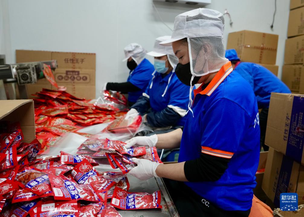 4月11日,工作人員在沈陽市陽陽食品有限公司封裝辣條。
