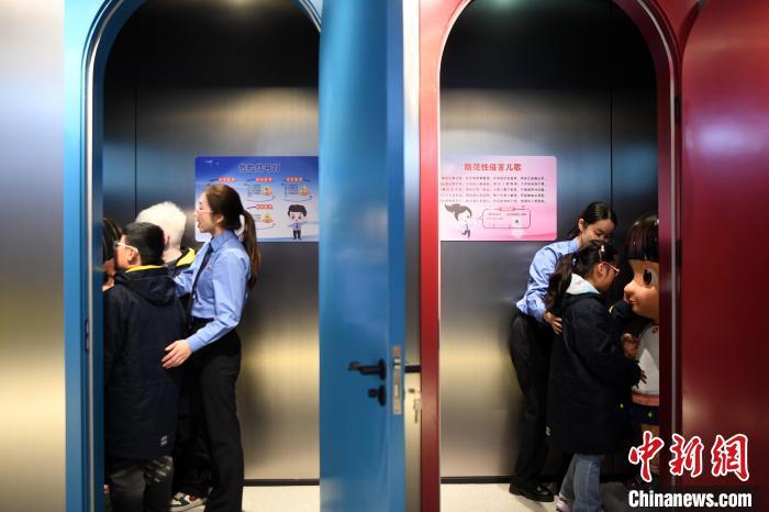 4月2日,在全國(guó)首個(gè)無(wú)障礙青少年法治教育基地,工作人員陪伴孩子在防范性侵展區(qū)了解相關(guān)知識(shí)。通過“人體紅綠燈”互動(dòng)展項(xiàng),可以增強(qiáng)孩子的自我保護(hù)意識(shí)。牛宏超供圖