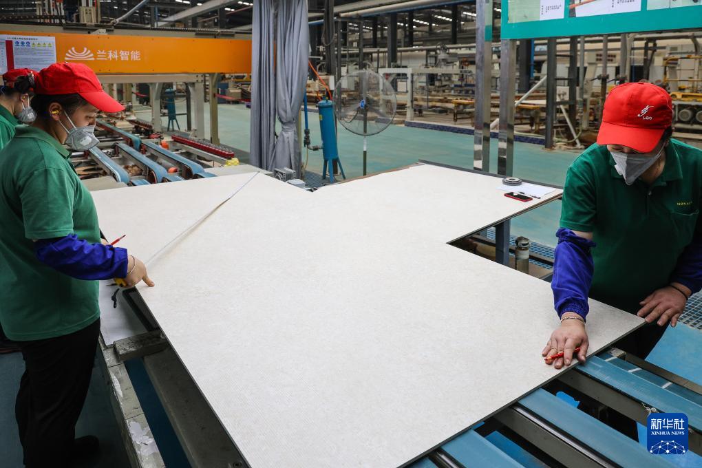 4月22日,工人在佛山蒙娜麗莎大尺寸陶瓷巖板自動生產(chǎn)線進行質(zhì)檢。質(zhì)檢是整條生產(chǎn)線上唯一的人工工序。