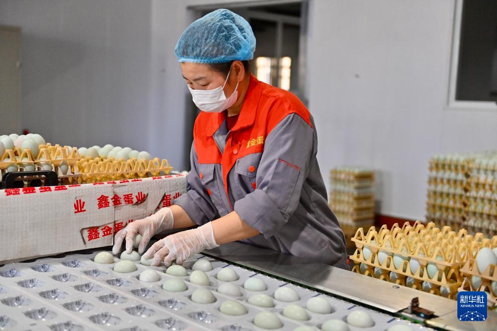 4月24日,在位于遼陽(yáng)市的遼寧鑫金科技實(shí)業(yè)集團(tuán)有限公司的加工廠內(nèi),工人將鴨蛋碼放到生產(chǎn)線上。