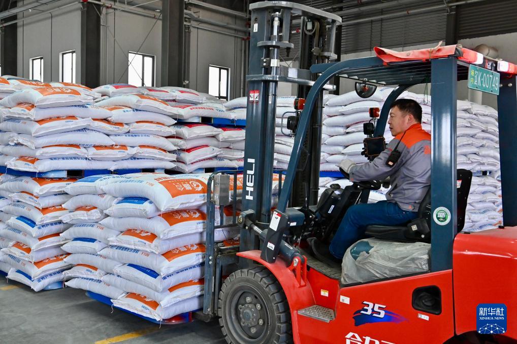 4月24日,在位于遼陽(yáng)市的遼寧鑫金科技實(shí)業(yè)集團(tuán)有限公司的飼料廠內(nèi),工人使用叉車(chē)搬運(yùn)飼料。