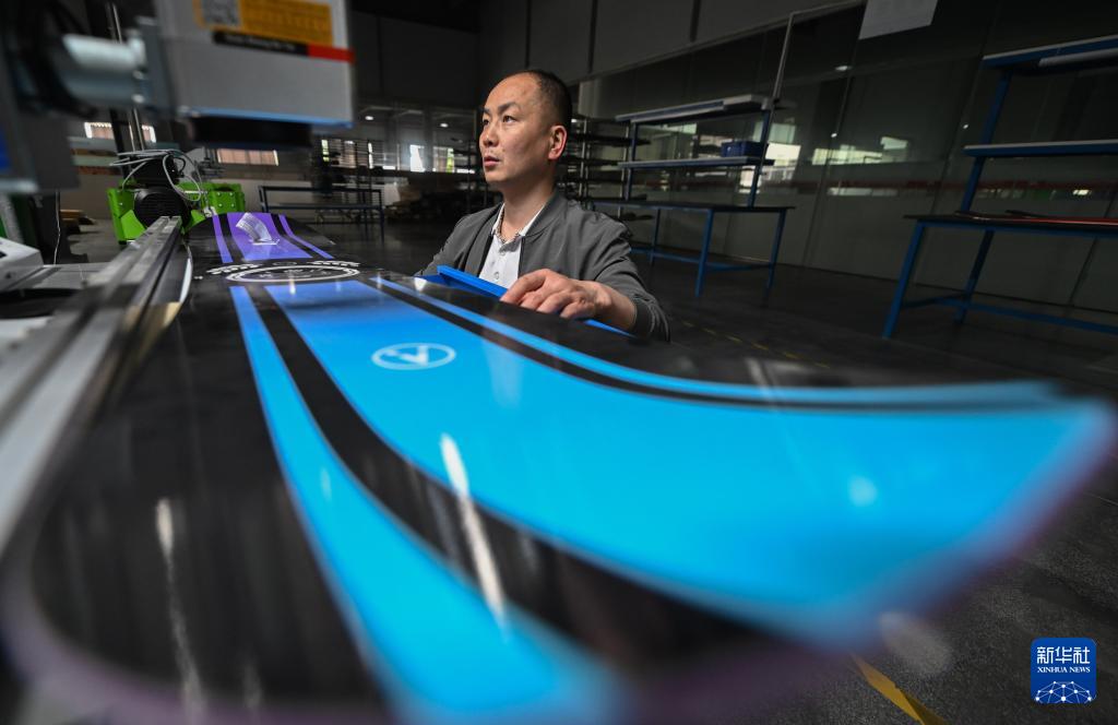 4月24日,在翔瑞馳公司生產車間,工人在生產的滑雪板上打標。該公司生產的雪板、雪鞋、固定器等產品已經出現(xiàn)在多個國際冰雪賽事上。