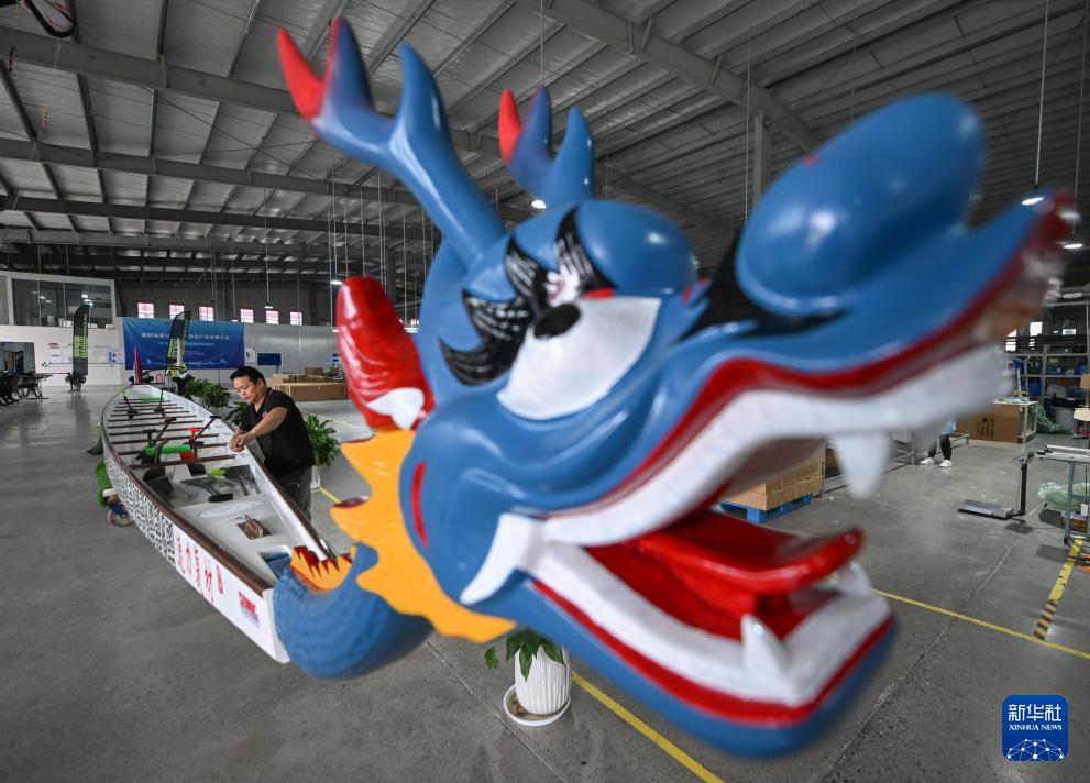 4月24日,在速力復合材料有限公司的生產車間內,工人在檢查一艘即將出廠的龍舟。