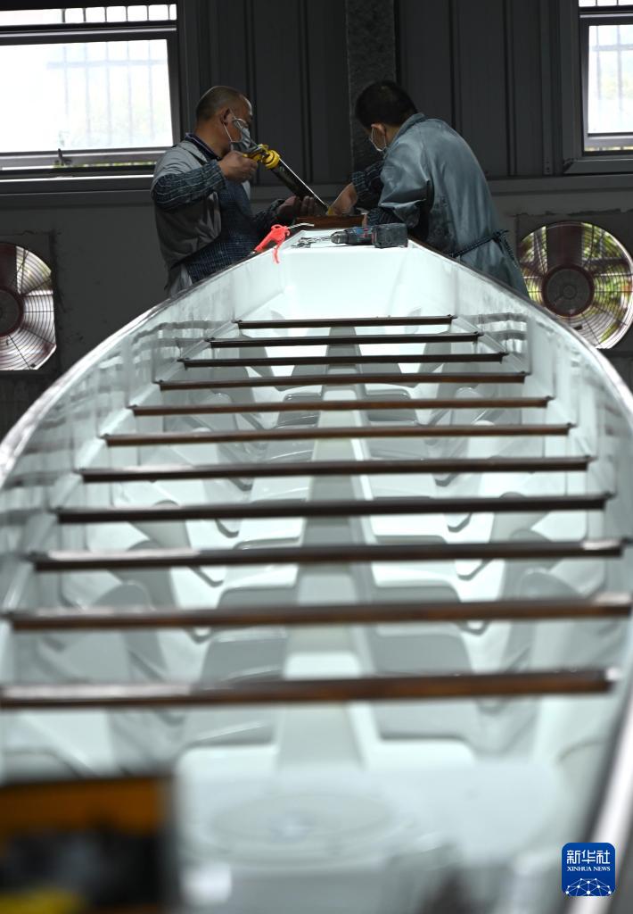 4月24日,兩名工人在速力復合材料有限公司生產車間龍舟生產線上工作。