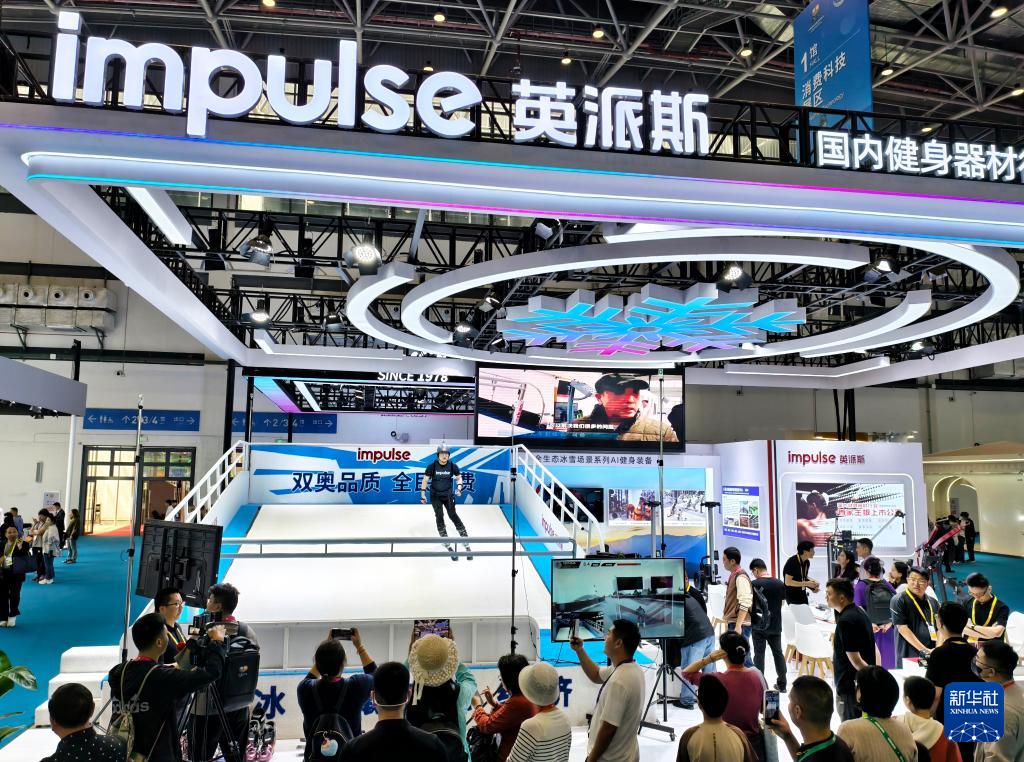 參觀者在海南國(guó)際會(huì)展中心舉行的消博會(huì)上觀看英派斯智能滑雪機(jī)演示(4月13日攝)。