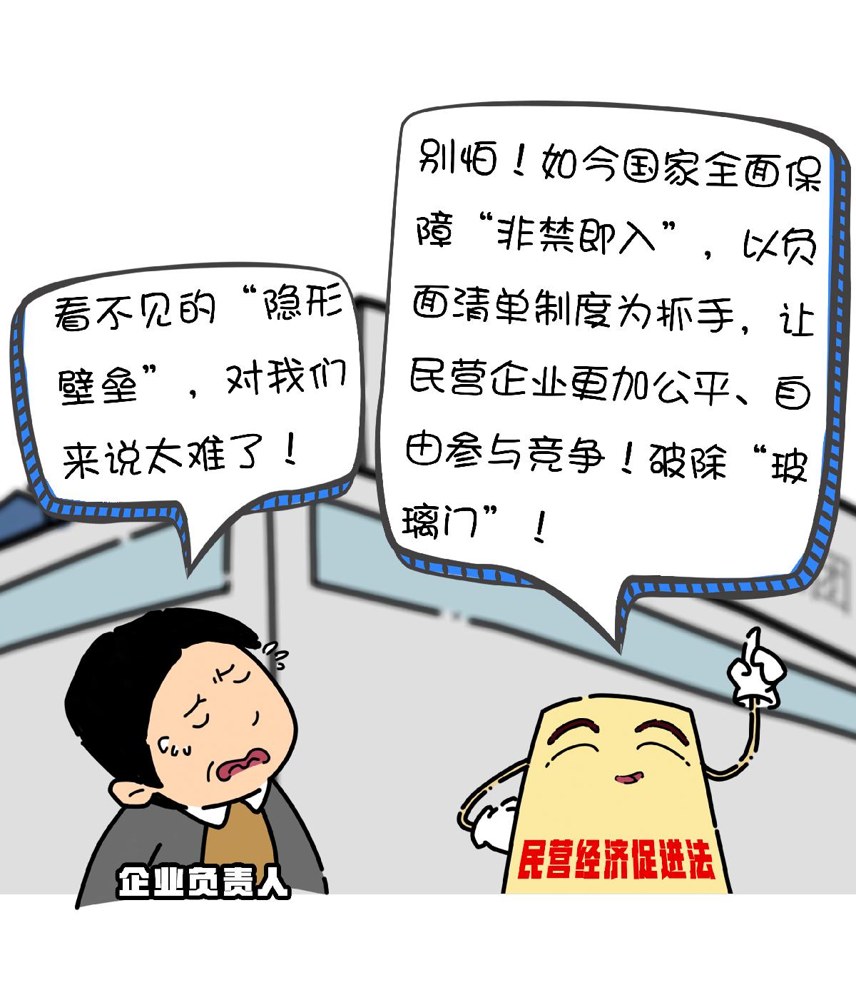 民營(yíng)經(jīng)濟(jì)促進(jìn)法第十條 國(guó)家實(shí)行全國(guó)統(tǒng)一的市場(chǎng)準(zhǔn)入負(fù)面清單制度。市場(chǎng)準(zhǔn)入負(fù)面清單以外的領(lǐng)域,包括民營(yíng)經(jīng)濟(jì)組織在內(nèi)的各類(lèi)經(jīng)濟(jì)組織可以依法平等進(jìn)入。