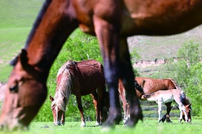 新疆伊犁新源縣那拉提“河谷草原”,正在食草的馬群。光明日報記者 閆匯芳攝