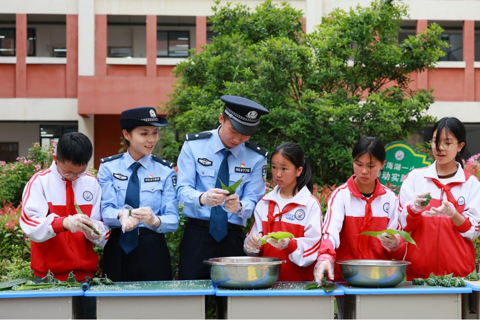活動現(xiàn)場,民警與學(xué)生們圍坐在一起,手把手教孩子們包粽子?!棒杖~要折成漏斗狀,米不能放太多,就像法律給我們的保護,既要周全也要適度?!泵窬贿吺痉?,一邊將民法典中與未成年人相關(guān)的條款融入講解。小小的粽子裹進了防霸凌、防溺水的小貼士,孩子們在體驗傳統(tǒng)文化的同時,潛移默化地學(xué)習(xí)了法律知識。