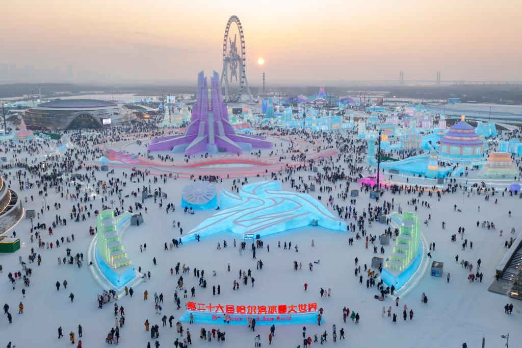 游客在哈爾濱冰雪大世界園區(qū)內(nèi)游玩(無人機照片)。新華社記者謝劍飛 攝