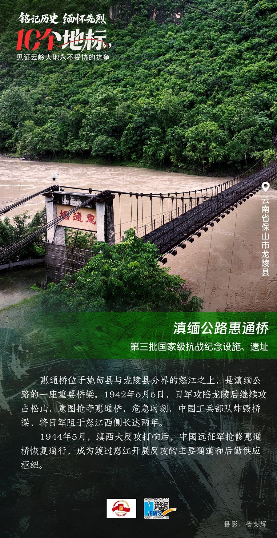 80年過去,曾經(jīng)的戰(zhàn)場硝煙雖散,但英氣永存。在國務(wù)院公布的前三批國家級抗戰(zhàn)紀念設(shè)施、遺址名錄中,云南省共有10個,分別為騰沖國殤墓園、騰沖滇西抗戰(zhàn)紀念館,龍陵抗日戰(zhàn)爭紀念館,國立西南聯(lián)合大學(xué)舊址,抗戰(zhàn)勝利紀念堂,松山戰(zhàn)役舊址,南洋華僑機工回國抗日紀念碑,怒江駝峰航線紀念館,施甸縣抗日江防遺跡群,滇緬公路惠通橋,滇西抗日戰(zhàn)爭紀念碑。它們承載著國人共同的歷史記憶與民族情感,也為我們學(xué)習和傳承抗戰(zhàn)精神提供了現(xiàn)實條件。