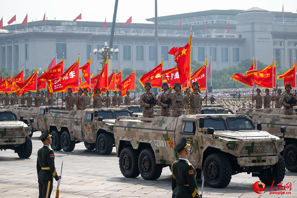 戰(zhàn)旗獵獵,鐵流滾滾。由80面抗戰(zhàn)英模部隊榮譽旗幟組成的戰(zhàn)旗方隊接受檢閱。