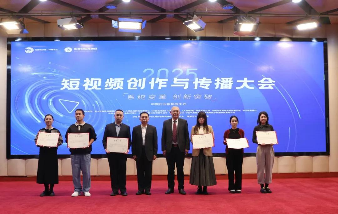 《人民鐵道》報業(yè)有限公司黨委書記、董事長譚小建(右四),《中國石油報》社有限公司總經(jīng)理、黨委副書記耿玉鋒(左四)向2025行業(yè)媒體短視頻大賽二等獎獲獎代表頒發(fā)證書。董芳忠/攝