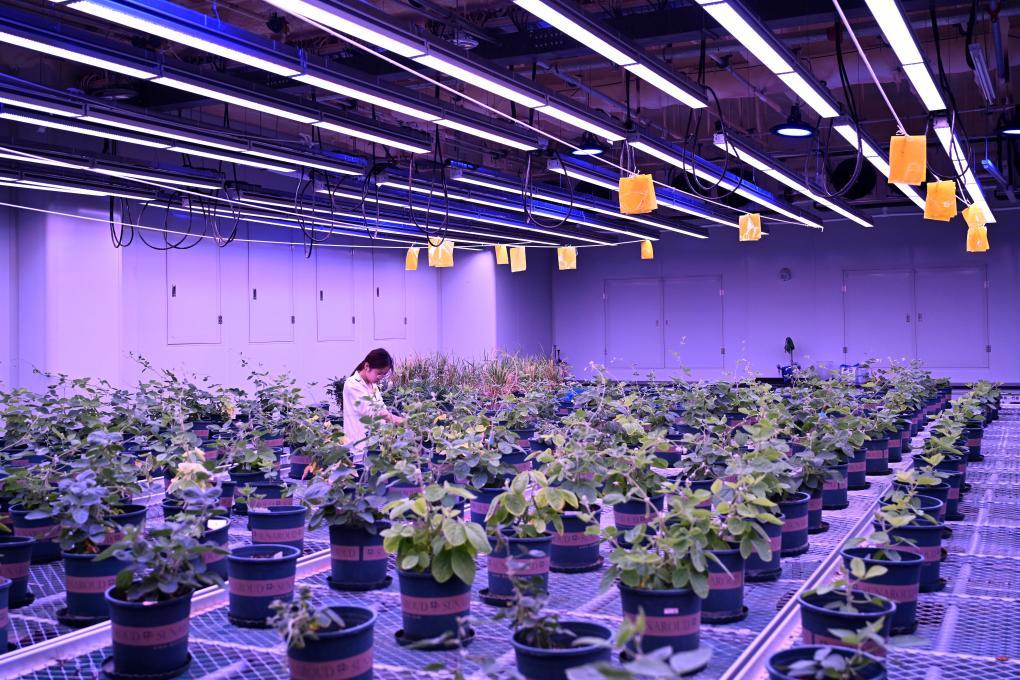 2025年7月6日,研究人員在位于安徽宿州的黃淮海(宿州)種業(yè)科技谷南京農(nóng)業(yè)大學(xué)大豆生物育種中心人工氣候室查看大豆長勢。新華社記者 黃博涵 攝
