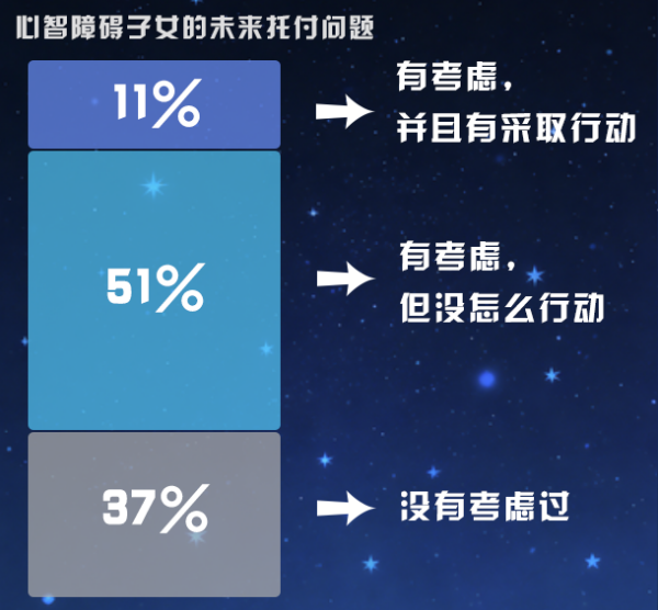 根據(jù)《心智障礙者家庭需求與未來托付調(diào)研報告》顯示,僅11%的家庭考慮過心智障礙子女的未來托付問題,并采取了行動;51%的家庭只是考慮過相關問題,但是沒有采取行動;而37%的家庭壓根沒有考慮過相關問題。
