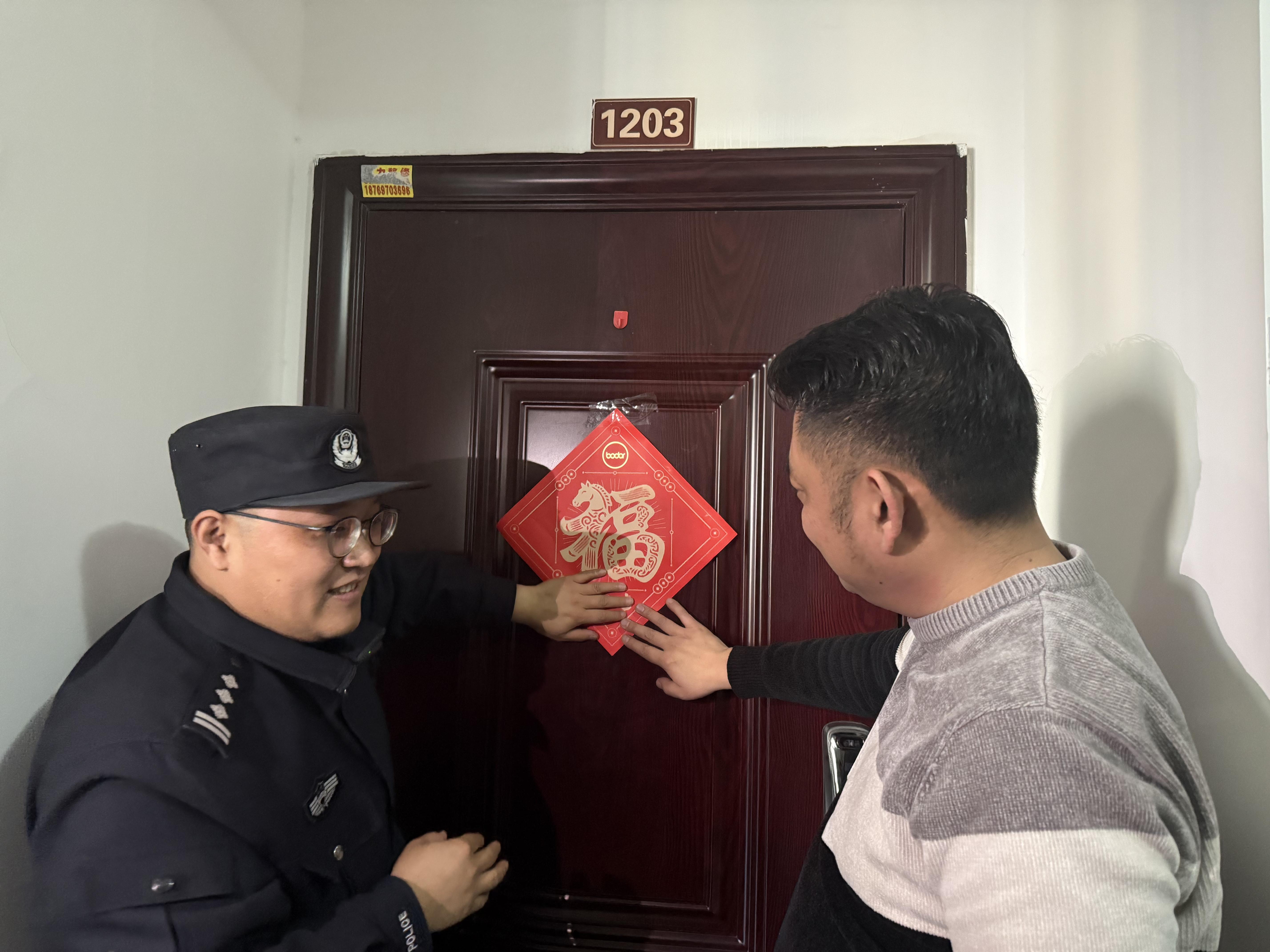 隨后,記者跟隨孫成磊來到虞山新居走訪。清理墻角堆放的紙箱、廢舊家具等易燃雜物,檢查消防栓是否完好無損、應(yīng)急通道是否暢通……在完成社區(qū)安全走訪排查工作后,孫成磊特意來到趙女士及其樓上孫先生家中,為兩戶人家送 “福” 字、貼“福”字?!懊芙忾_了,煩心事沒有了,民警的‘福’字也送到了,我們和和氣氣、心情舒暢迎新春。”趙女士說。
