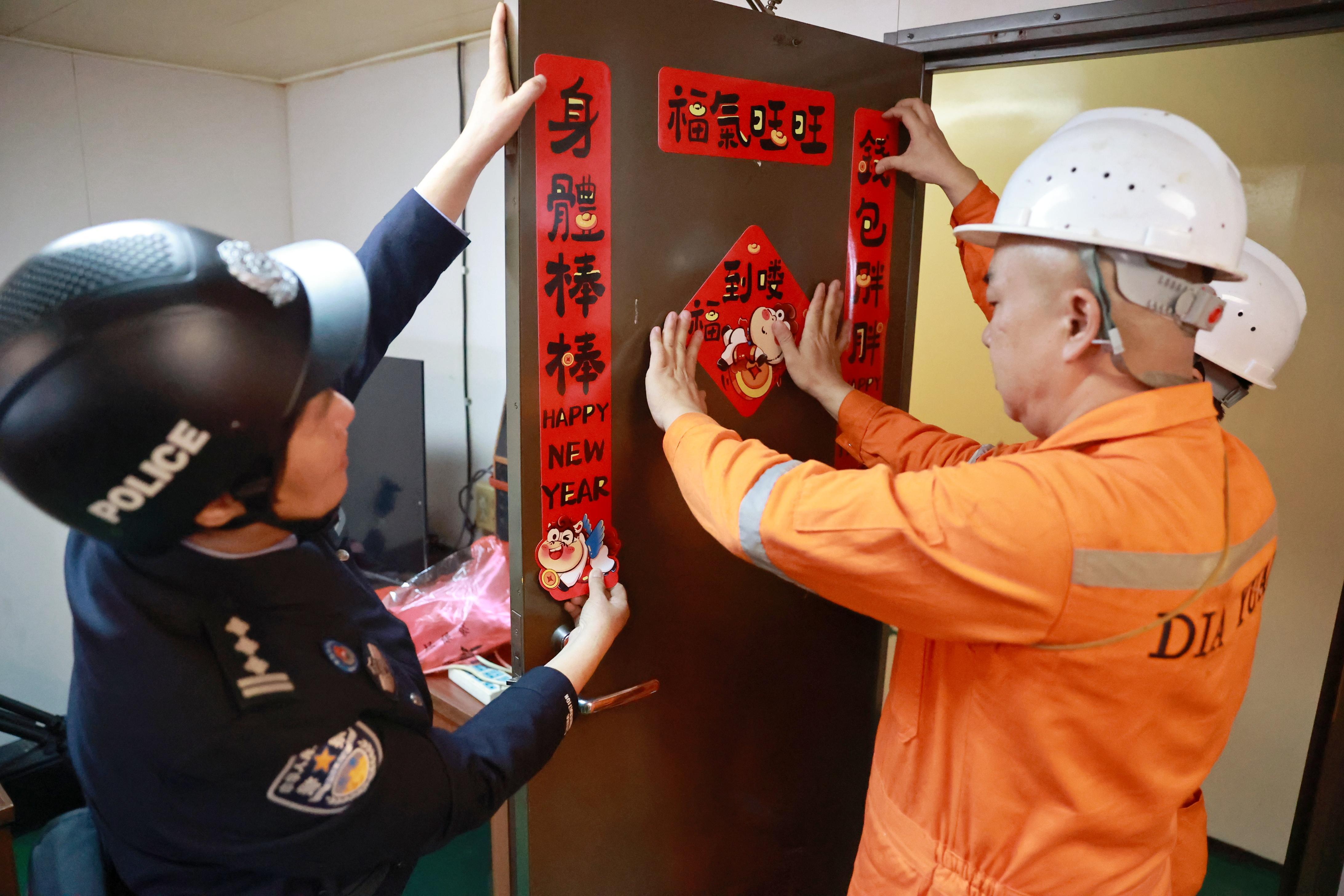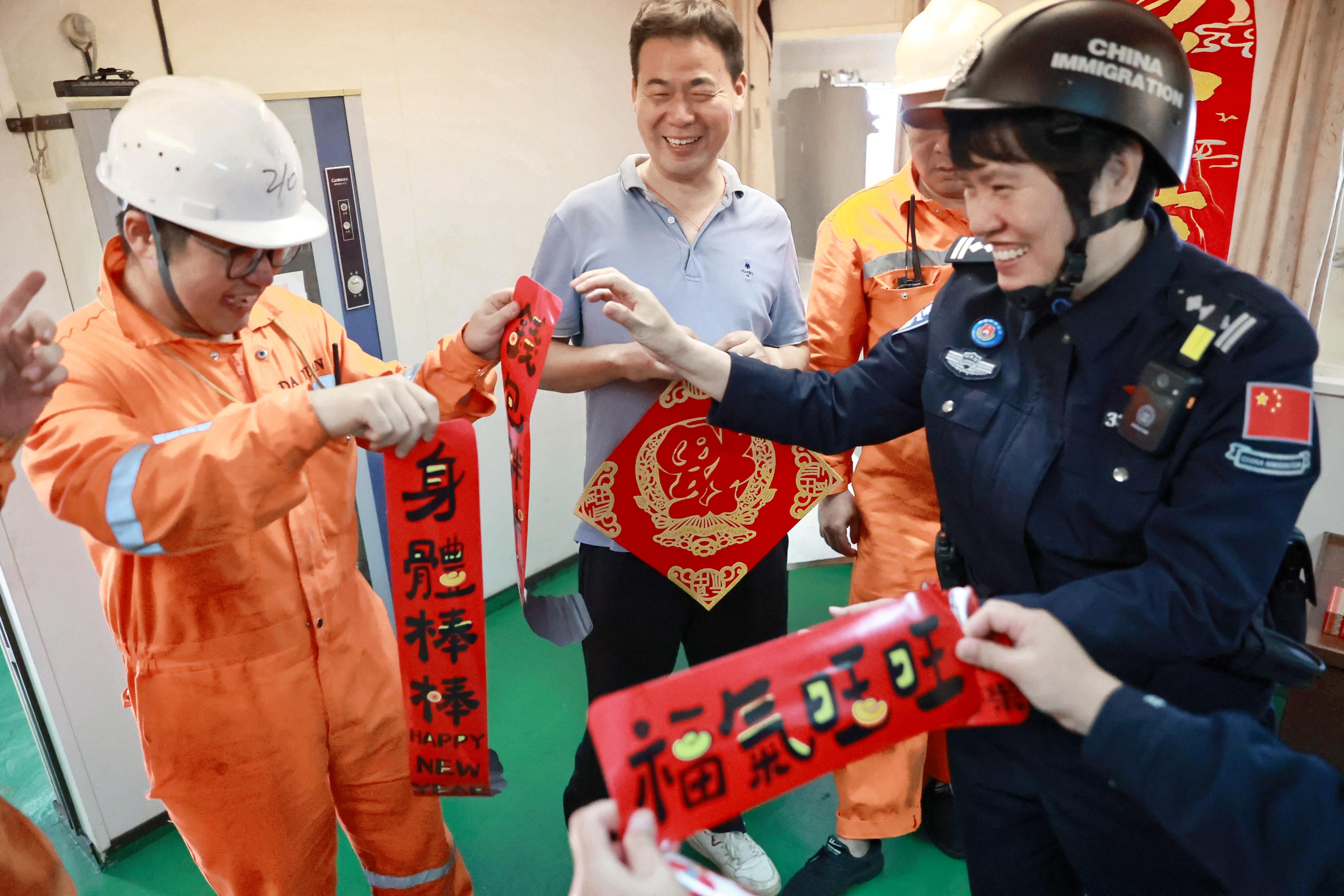 民警們在高效完成船舶查驗手續(xù)后,將一幅幅寓意吉祥的春聯(lián)、紅燈籠和“福”字送到船員手中,并一同將“福”字張貼在船艙門窗上,原本簡潔的船艙頓時有了過年的紅火氣氛。
