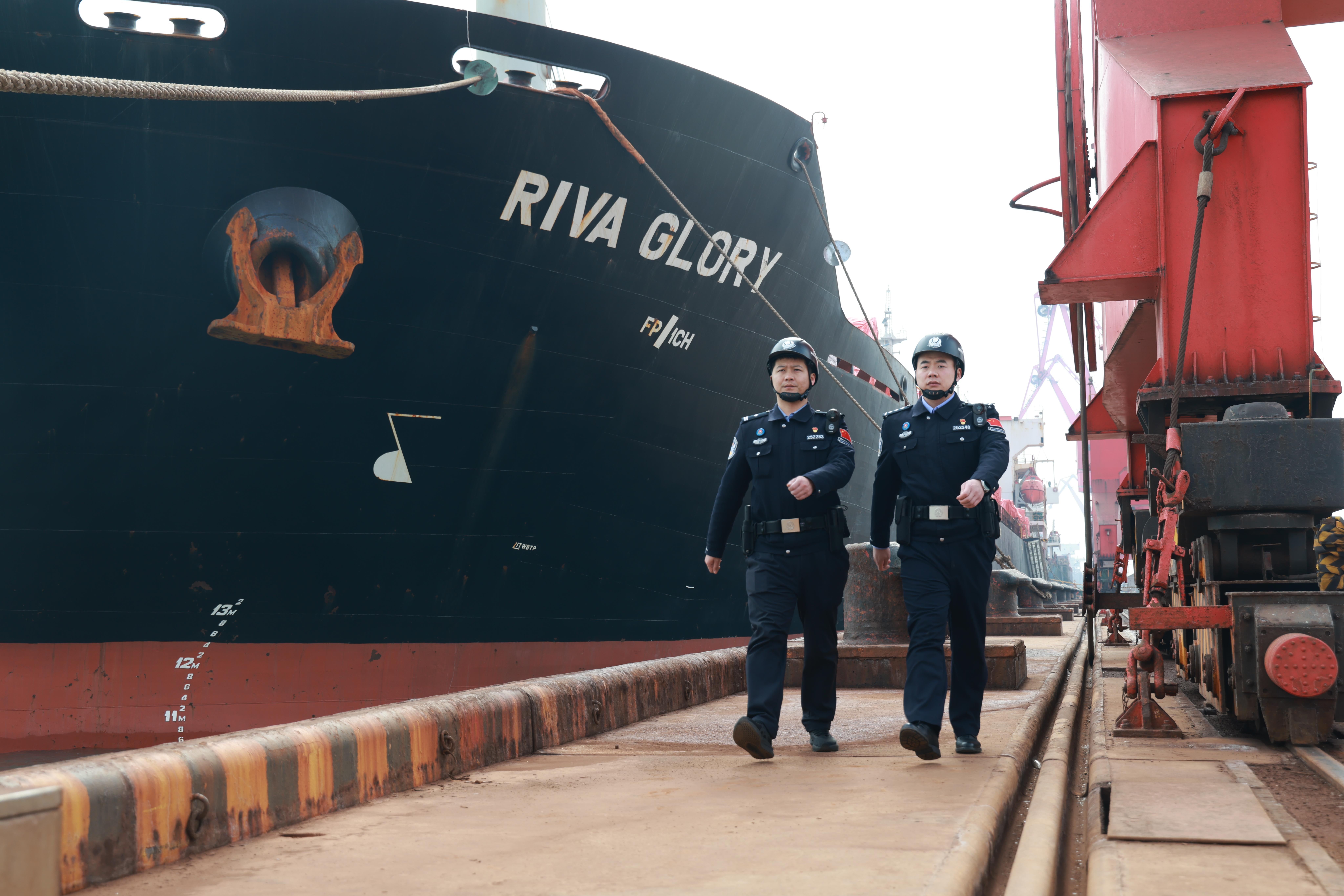 2月10日,天剛放亮,該站執(zhí)勤三隊民警周威成、王學(xué)兵正在巴拿馬籍“瑞?!陛喤匝膊?。這艘名字里自帶“年味兒”的貨輪,正忙著裝載國產(chǎn)鋼材、工程設(shè)備和各類車輛,整裝待發(fā)奔赴阿聯(lián)酋,將“中國制造”送往共建“一帶一路”國家。