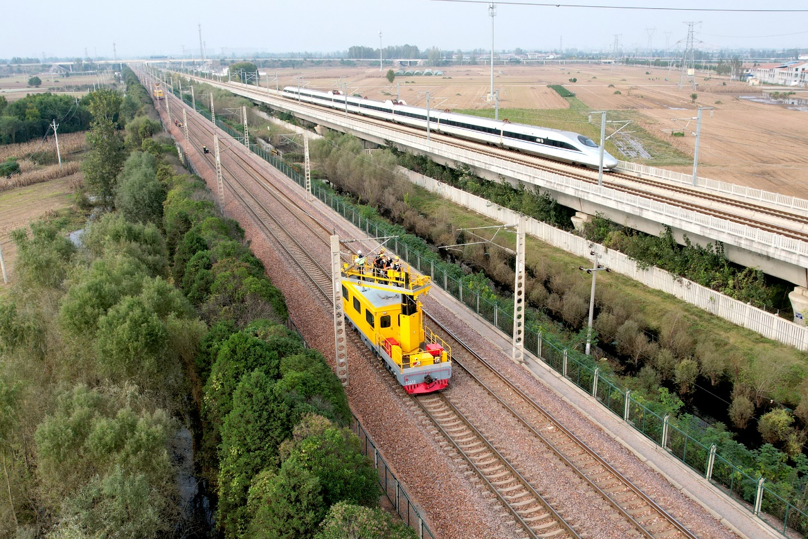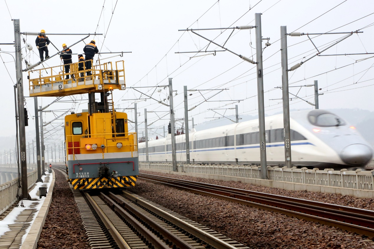 圖為鄭州供電段職工操作作業(yè)車對接觸網(wǎng)開展全面檢查。