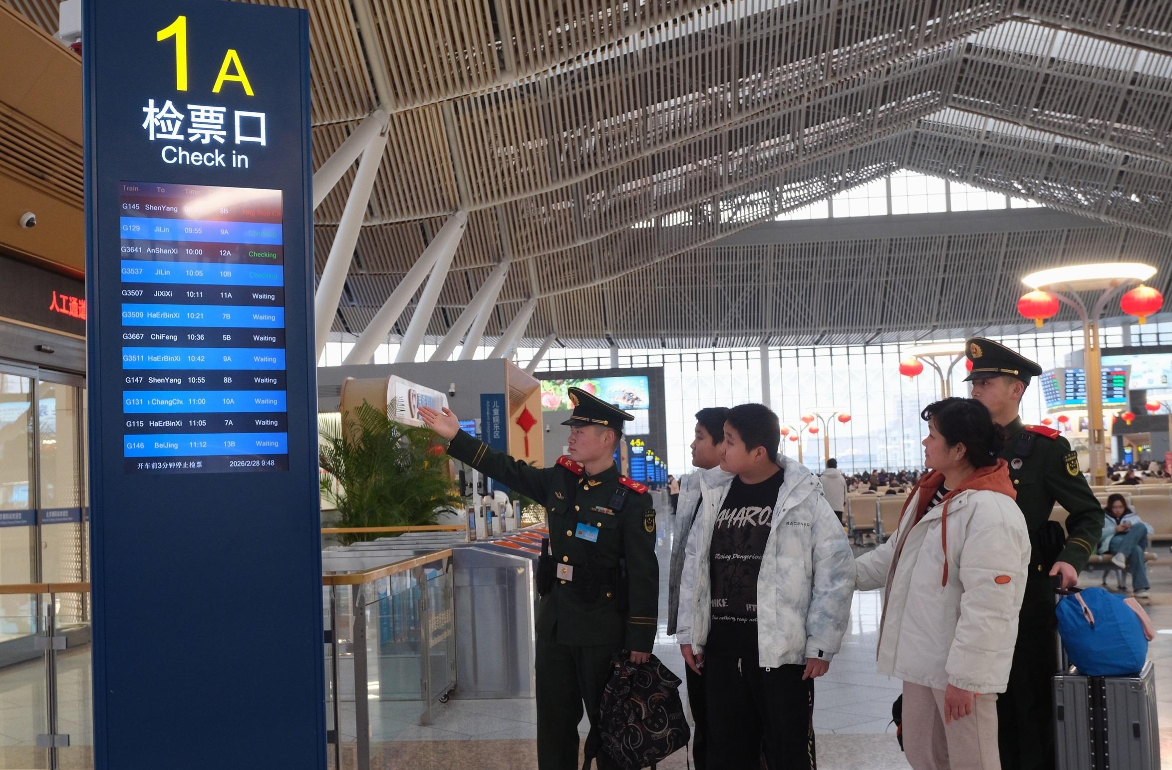 春運(yùn)的早晨,北京朝陽(yáng)站人流如織。“同志,幫我看看這趟列車應(yīng)該在哪等啊?”“您跟我來(lái),我?guī)?。?/p>
