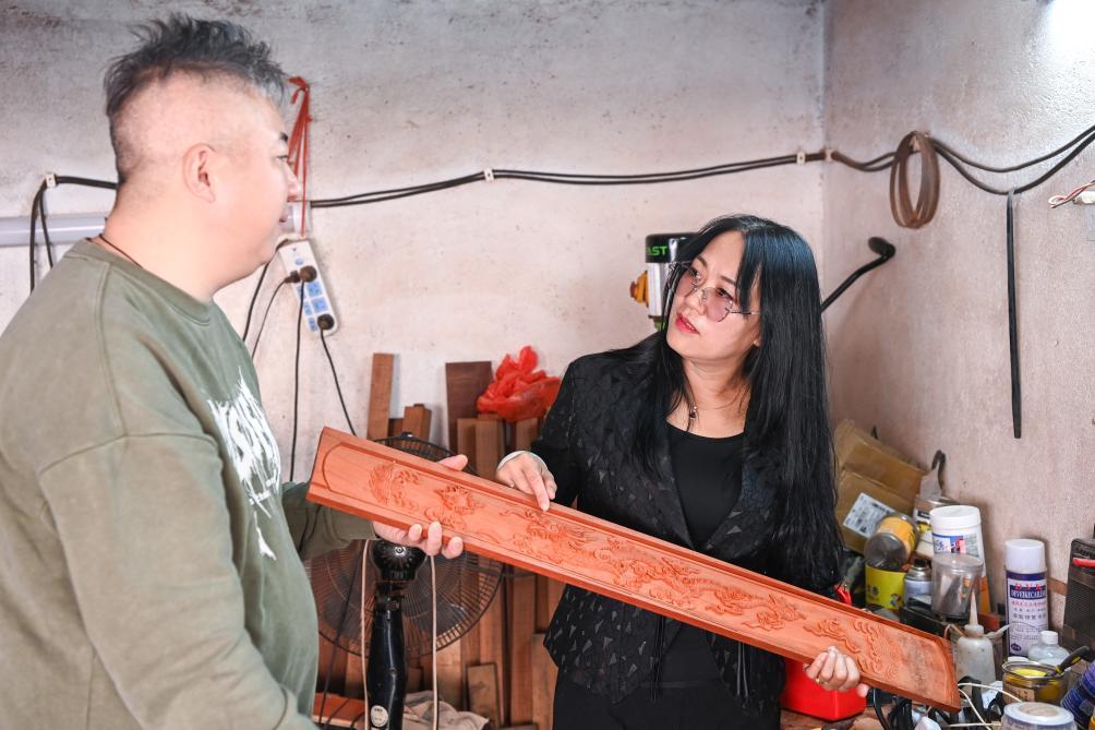 2月7日,在廣西東興市,蘇海珍(右)與獨弦琴制作匠人討論琴身材質(zhì)和紋飾。