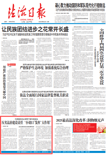 今年全國(guó)兩會(huì)上,多位人大代表、政協(xié)委員接受《法治日?qǐng)?bào)》記者采訪時(shí)表示,在述法現(xiàn)場(chǎng),地方黨政主要負(fù)責(zé)人以第一人稱述“我”,向上級(jí)“一把手”匯報(bào)年度依法履職情況,通過(guò)“一把手抓一把手”的“小切口”,發(fā)揮壓實(shí)“關(guān)鍵少數(shù)”法治建設(shè)責(zé)任的“大作用”,已成為提升領(lǐng)導(dǎo)干部依法辦事能力的重要手段、推動(dòng)突出問(wèn)題解決的重要渠道和公眾參與法治建設(shè)評(píng)價(jià)的重要途徑。