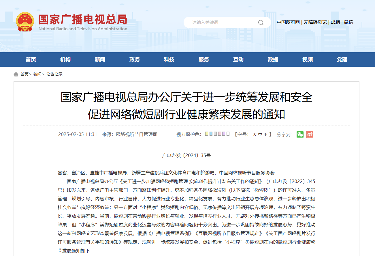 國家廣播電視總局辦公廳發(fā)布《關于進一步統籌發(fā)展和安全促進網絡微短劇行業(yè)健康繁榮發(fā)展的通知》