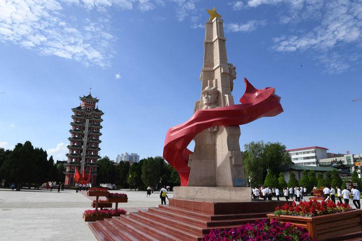 這是2019年7月22日在甘肅會寧縣紅軍會寧會師舊址拍攝的雕塑和會師紀念塔。新華社記者 馬寧 攝