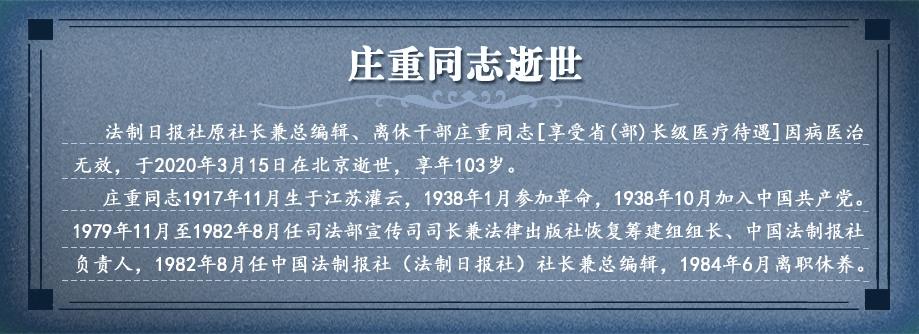 莊重老社長逝世,我很悲慟。悲慟之余,他在法制報(bào)創(chuàng)辦初期的感人事跡浮現(xiàn)在我的腦海中。 1979年,中央組織部向在京各部委發(fā)文,要求抽調(diào)一批干部支援公安部、最高檢、最高法、司法部、民政部、安全部。莊重同志于1979年11月調(diào)入司法部,分配在宣傳司為負(fù)責(zé)人,同時(shí)領(lǐng)導(dǎo)籌備法制報(bào),這時(shí)宣傳司與法制報(bào)為同一個(gè)單位,兩年后分開。分開時(shí)莊重為宣傳司司長、法制報(bào)社黨委書記、社長、總編輯,一時(shí)身兼四職,可見人氣十足。【詳細(xì)】