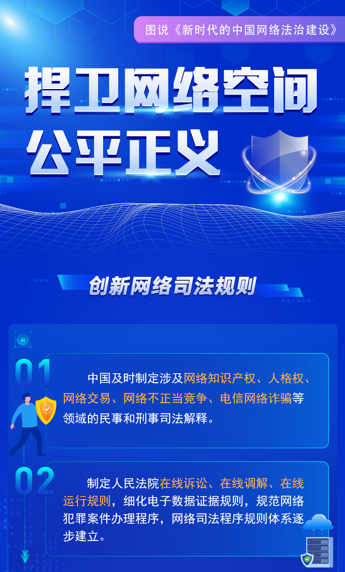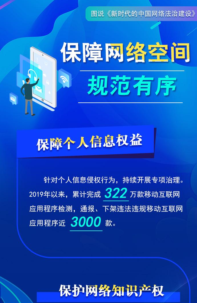自1994年全功能接入國際互聯(lián)網(wǎng)以來,中國堅持依法治網(wǎng),持續(xù)推進(jìn)網(wǎng)絡(luò)空間法治化,推動互聯(lián)網(wǎng)在法治軌道上健康運(yùn)行。進(jìn)入新時代,在習(xí)近平新時代中國特色社會主義思想指引下,中國將依法治網(wǎng)作為全面依法治國和網(wǎng)絡(luò)強(qiáng)國建設(shè)重要內(nèi)容,努力構(gòu)建完備的網(wǎng)絡(luò)法律規(guī)范體系、高效的網(wǎng)絡(luò)法治實(shí)施體系、嚴(yán)密的網(wǎng)絡(luò)法治監(jiān)督體系、有力的網(wǎng)絡(luò)法治保障體系,網(wǎng)絡(luò)法治建設(shè)取得歷史性成就。