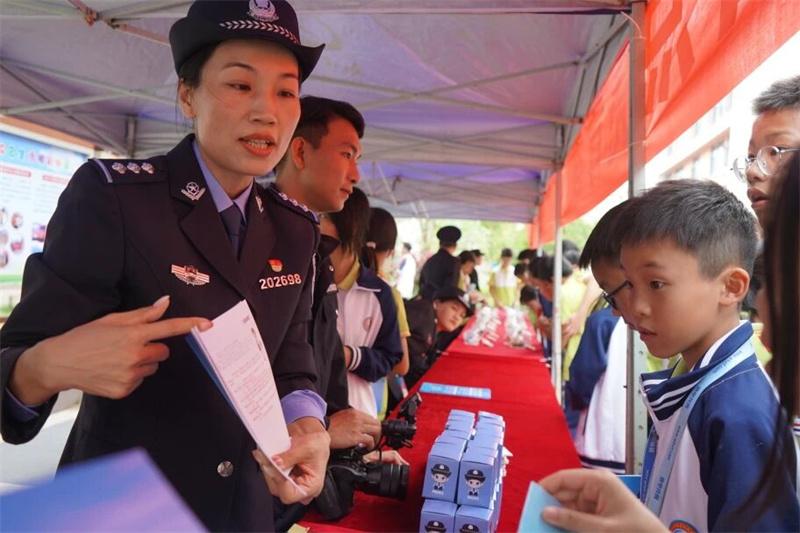 課室外,多部門聯(lián)合打造的“法治移動課堂”同步鋪開,形成全方位普法矩陣。在仿真毒品展示區(qū),禁毒民警結(jié)合新型毒品模型,揭露“跳跳糖”“奶茶粉”等偽裝手段,深刻警示學(xué)生警惕“第一口”誘惑;交警部門將流動宣傳車開進(jìn)操場,循環(huán)播放本地交通事故警示片,血淋淋的案例讓圍觀學(xué)生直呼“安全帶就是生命帶”?!?/p>
