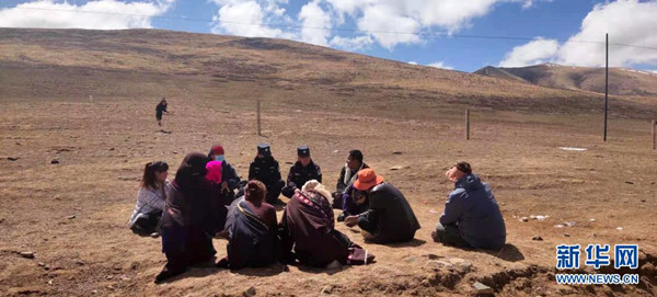 在青海省果洛藏族自治州瑪沁縣優(yōu)云鄉(xiāng),糾紛調(diào)解工作組的多杰扎西(后排穿警服右)、仁青卓瑪(后排穿警服左)和牧民們席地而坐,了解矛盾的詳細情況(4月18日攝)。