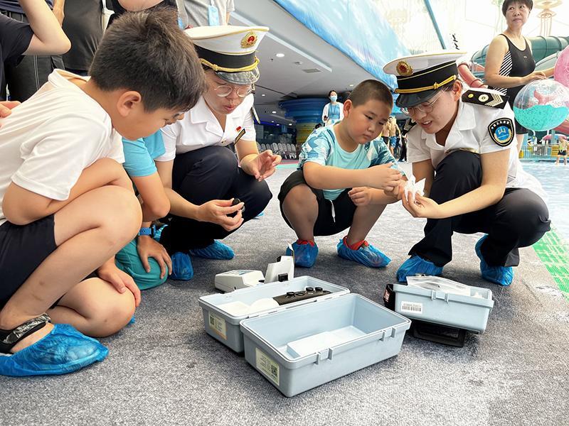 7月19日,北京市衛(wèi)生健康監(jiān)督所開展“關(guān)注泳池水質(zhì) 體驗(yàn)衛(wèi)監(jiān)執(zhí)法”開放日活動(dòng),邀請(qǐng)市民朋友走進(jìn)水立方嬉水樂(lè)園,親身體驗(yàn)游泳場(chǎng)所衛(wèi)生監(jiān)督全過(guò)程。圖為衛(wèi)生監(jiān)督員邀請(qǐng)小朋友一同體驗(yàn)快速檢測(cè)泳池水余氯情況。