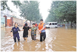 圖為河北省涿州市公安局雙塔派出所民警正在轉移受災群眾。 本報通訊員 于波 攝