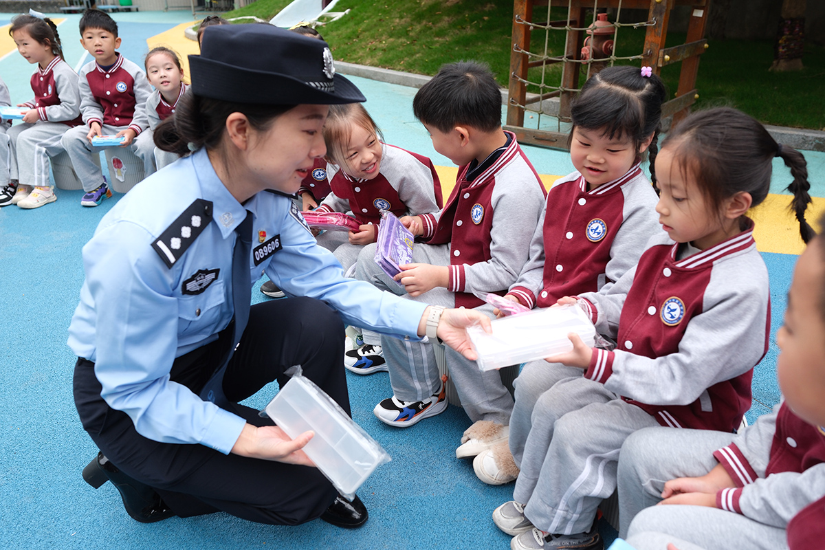 近日,杭州鐵路公安處嘉興站派出所民警組成愛路護路宣傳小分隊,來到嘉興市第三幼兒園開展安全宣傳活動。圖為民警向小朋友講解鐵路安全及乘車安全知識。 本報通訊員 賀瑞明 徐燁 攝