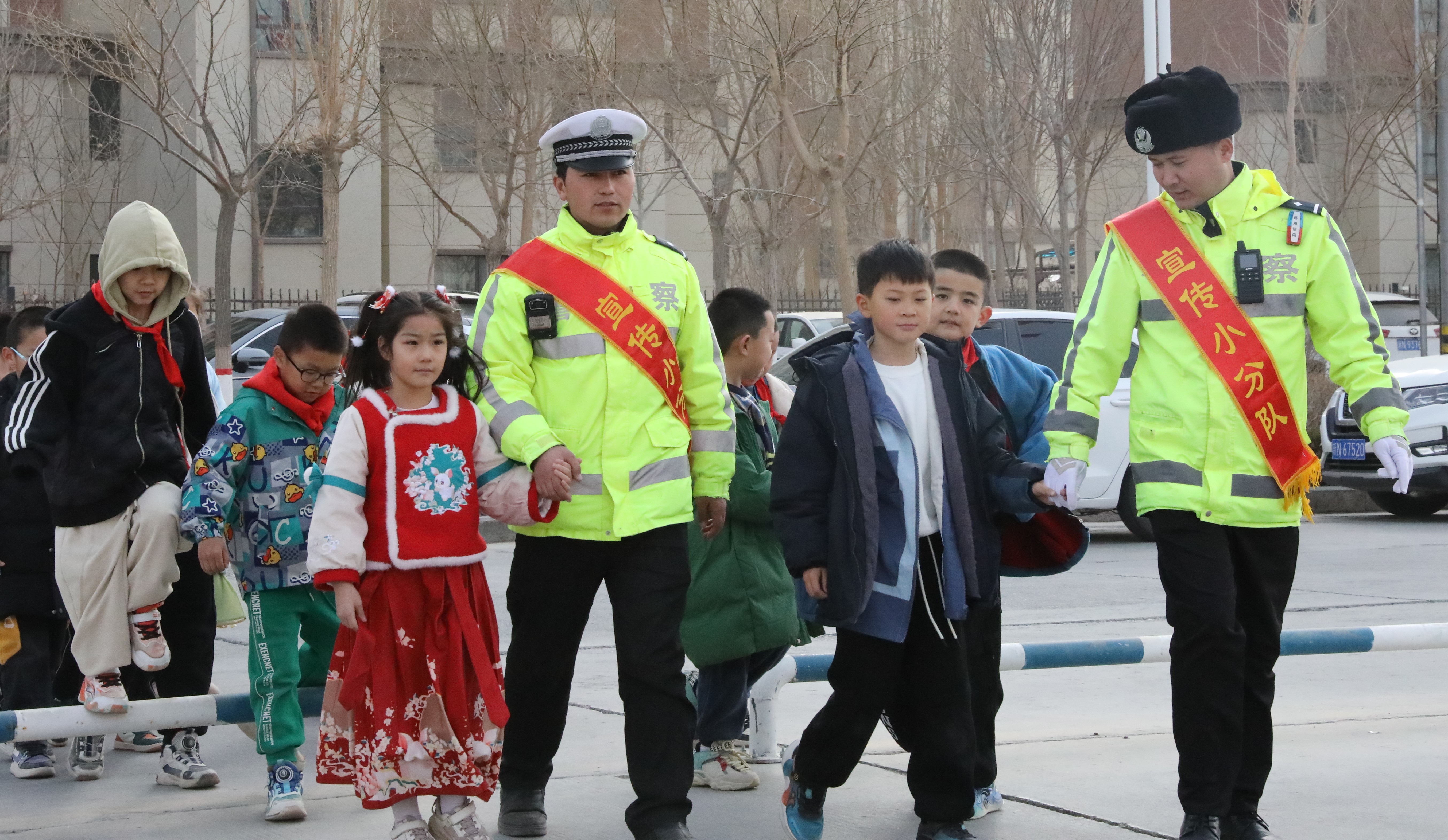 2月25日新學(xué)期的第一天,新疆維吾爾自治區(qū)阿克蘇地區(qū)溫宿縣公安局交通管理大隊(duì)民警走進(jìn)溫宿縣第八中學(xué),開展“開學(xué)第一課”交通安全主題宣傳活動(dòng)。圖為民警在學(xué)校操場上模擬現(xiàn)實(shí)場景,為學(xué)生們講解如何正確過馬路。