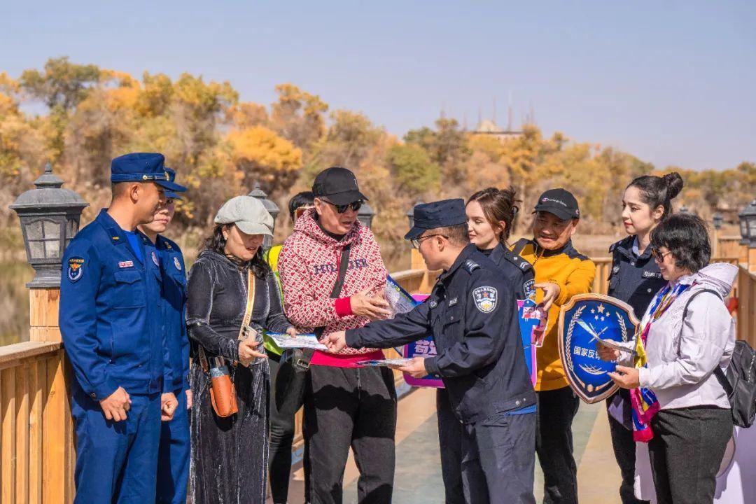 新疆巴楚縣公安局民輔警在景區(qū)向游客宣傳反詐知識(shí)