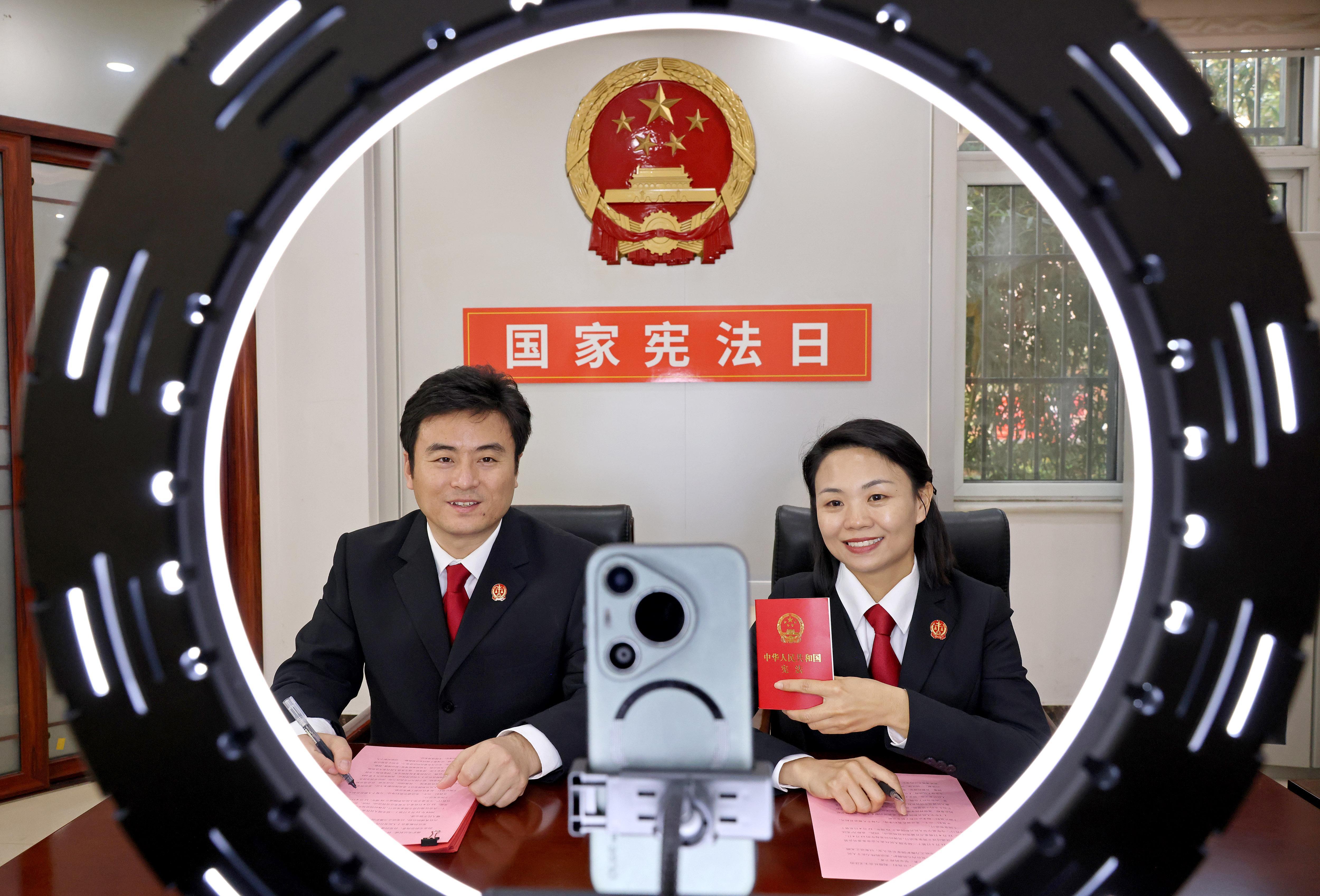 12月3日,山東省棗莊市市中區(qū)人民法院開(kāi)展“憲法宣傳周”活動(dòng),兩名法官通過(guò)線上直播方式向觀眾宣傳憲法知識(shí)。圖為法官講解國(guó)家憲法日的由來(lái)。