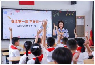 9月1日,開學(xué)首日,江蘇省常州市公安局鐘樓分局北大街派出所組織民警走進覓渡橋小學(xué),開展“開學(xué)安全教育第一課”法治宣講活動。圖為民警在課堂上與學(xué)生們互動。