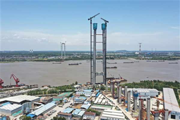 正在建設(shè)中的龍?zhí)堕L(zhǎng)江大橋位于南京長(zhǎng)江四橋與潤(rùn)揚(yáng)長(zhǎng)江大橋之間,北接揚(yáng)州儀征市,南接南京市、鎮(zhèn)江句容市,雙向六車道,設(shè)計(jì)時(shí)速100公里,全長(zhǎng)4925米。新華社記者 楊磊 攝