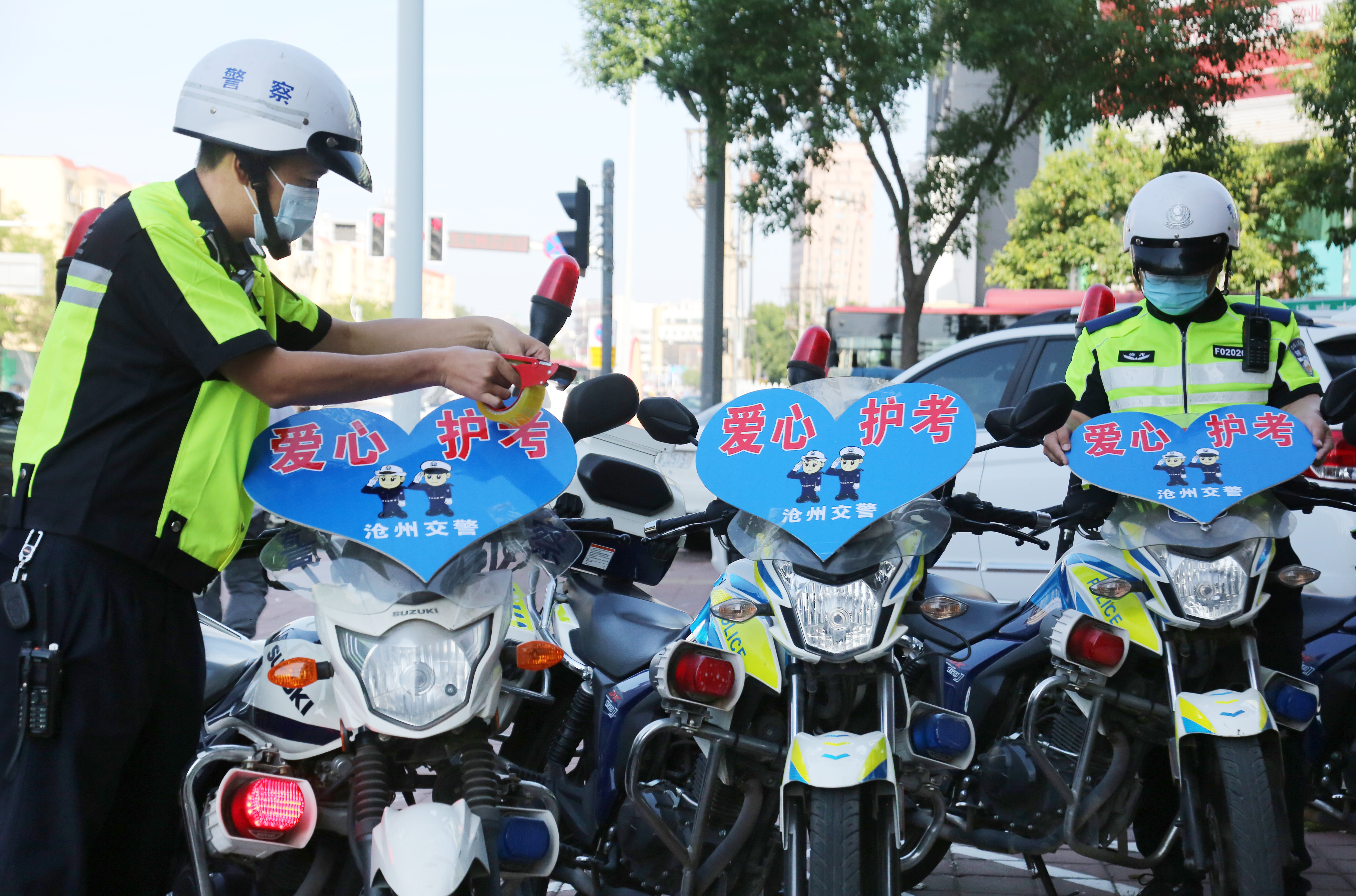 高考在即,河北省滄州市交警提前部署高考護(hù)考管控措施,參加維護(hù)高考交通秩序和護(hù)送考生車輛的執(zhí)勤交警提前進(jìn)入高考狀態(tài),以良好的精神狀態(tài)為高考學(xué)子和接送考生的車輛“護(hù)航”。圖為滄州市公安交警支隊(duì)二大隊(duì)鐵騎交警提前行動(dòng),細(xì)心檢查摩托車機(jī)械運(yùn)行狀況、粘貼“愛心護(hù)考”標(biāo)識(shí)牌,“備戰(zhàn)”高考。