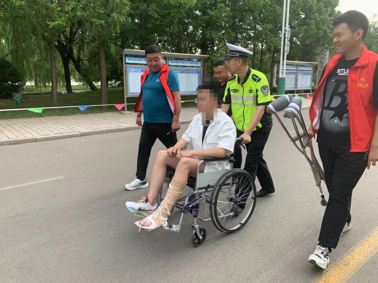6月7日上午7時(shí)10分許,山東省諸城市公安局交警大隊(duì)民警在諸城一中高考考點(diǎn)執(zhí)勤時(shí),接到一名考生家長(zhǎng)求助稱(chēng),其兒子在高考前左腳跖骨不慎骨折,打上了厚厚的石膏,導(dǎo)致行動(dòng)不便。由于考點(diǎn)周邊道路實(shí)行交通管制以保障高考順利進(jìn)行,社會(huì)車(chē)輛無(wú)法通行,所以家長(zhǎng)向執(zhí)勤交警求助。