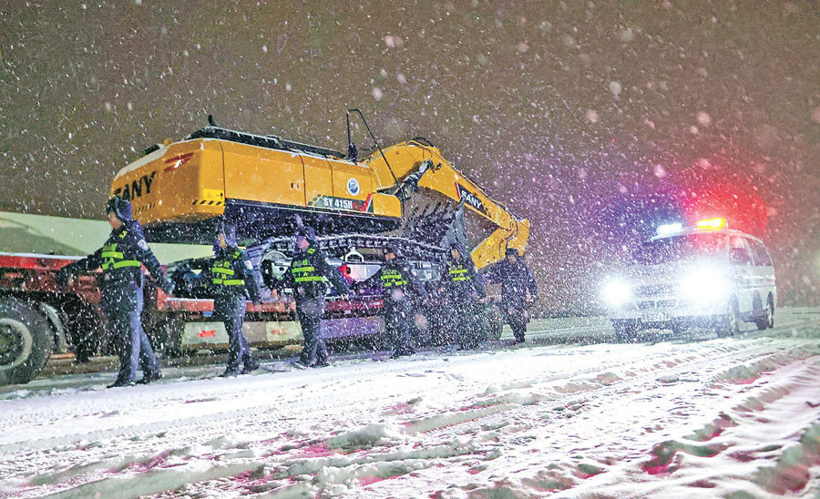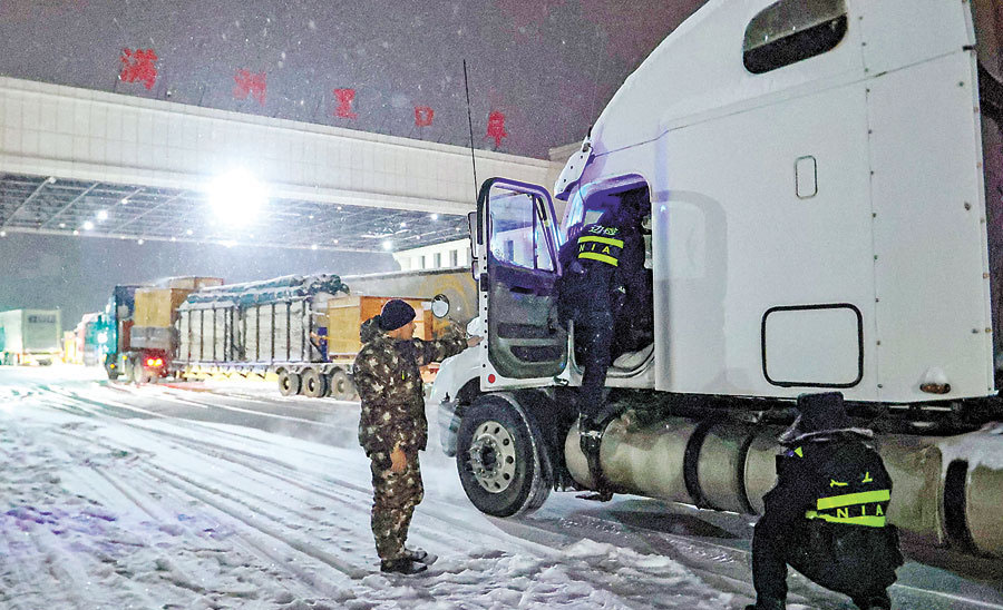 12月7日晚,內蒙古自治區(qū)滿洲里市遭遇強降雪天氣,氣溫降至零下30攝氏度,滿洲里出入境邊防檢查站迅速啟動應急預案,加強口岸管控力度,強化重點區(qū)域巡查,確??诎锻P安全有序。(李發(fā)春)