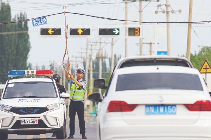 圖為民警冒著高溫,用斷落樹枝頂起光纜,以保證車輛順暢通行。胡國華攝