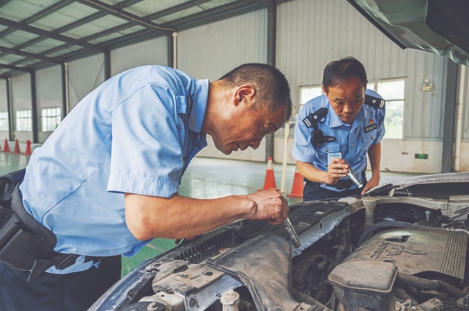 圖為民警仔細查驗車輛,汗水順著鼻尖往下滴。孫崇明攝