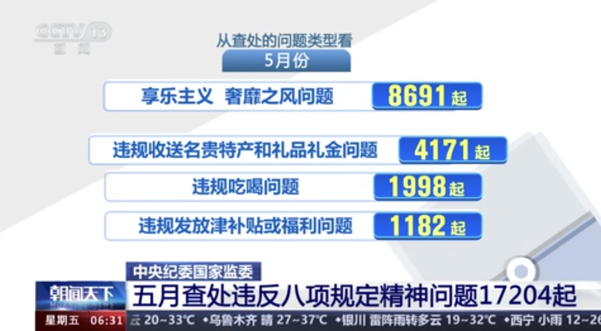 中央紀(jì)委國家監(jiān)委 五月查處違反八項規(guī)定精神問題17204起