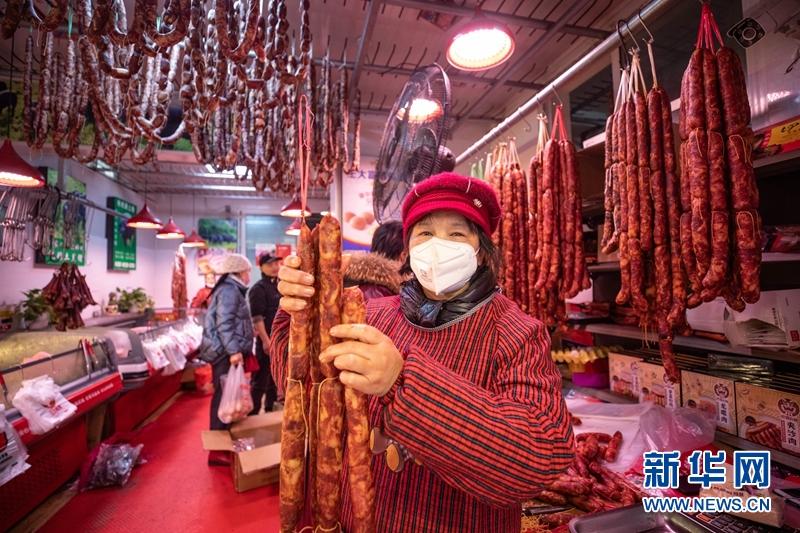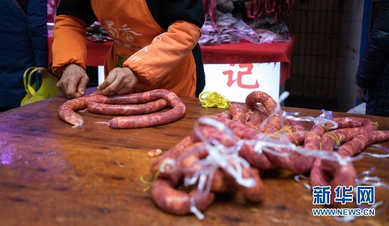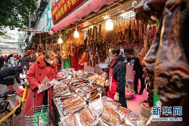 在成都市新開寺街,街道兩旁的肉鋪掛滿了香腸臘肉,市民在肉鋪前挑選香腸臘肉。