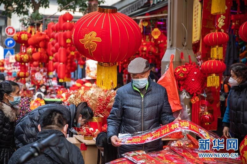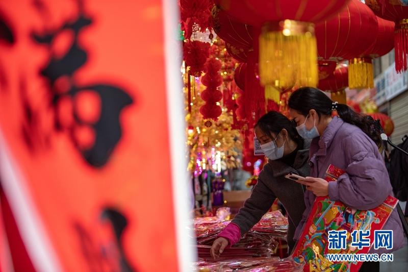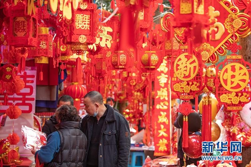 市民在成都荷花池批發(fā)市場商鋪采購春聯(lián)、“?!弊值葌鹘y(tǒng)年貨。