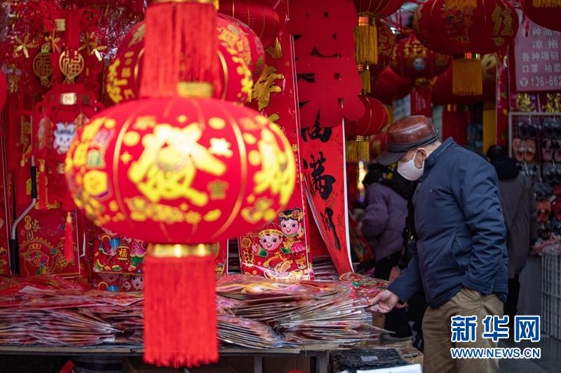 市民在商鋪采購春聯(lián)、“?!弊值葌鹘y(tǒng)年貨。